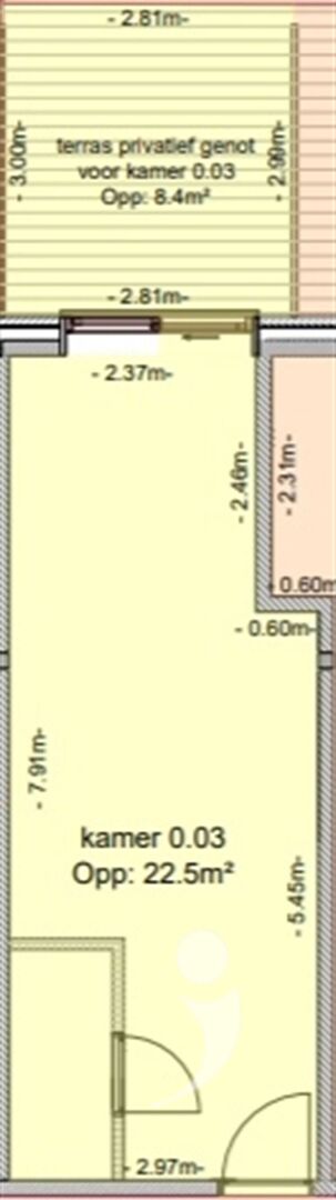 This room is located at the back of residence Archive 0.2 on the ground floor and features a private bathroom with sink, shower, and toilet. There is also a built-in refrigerator. From the room you also have access to the private terrace and communal garden.