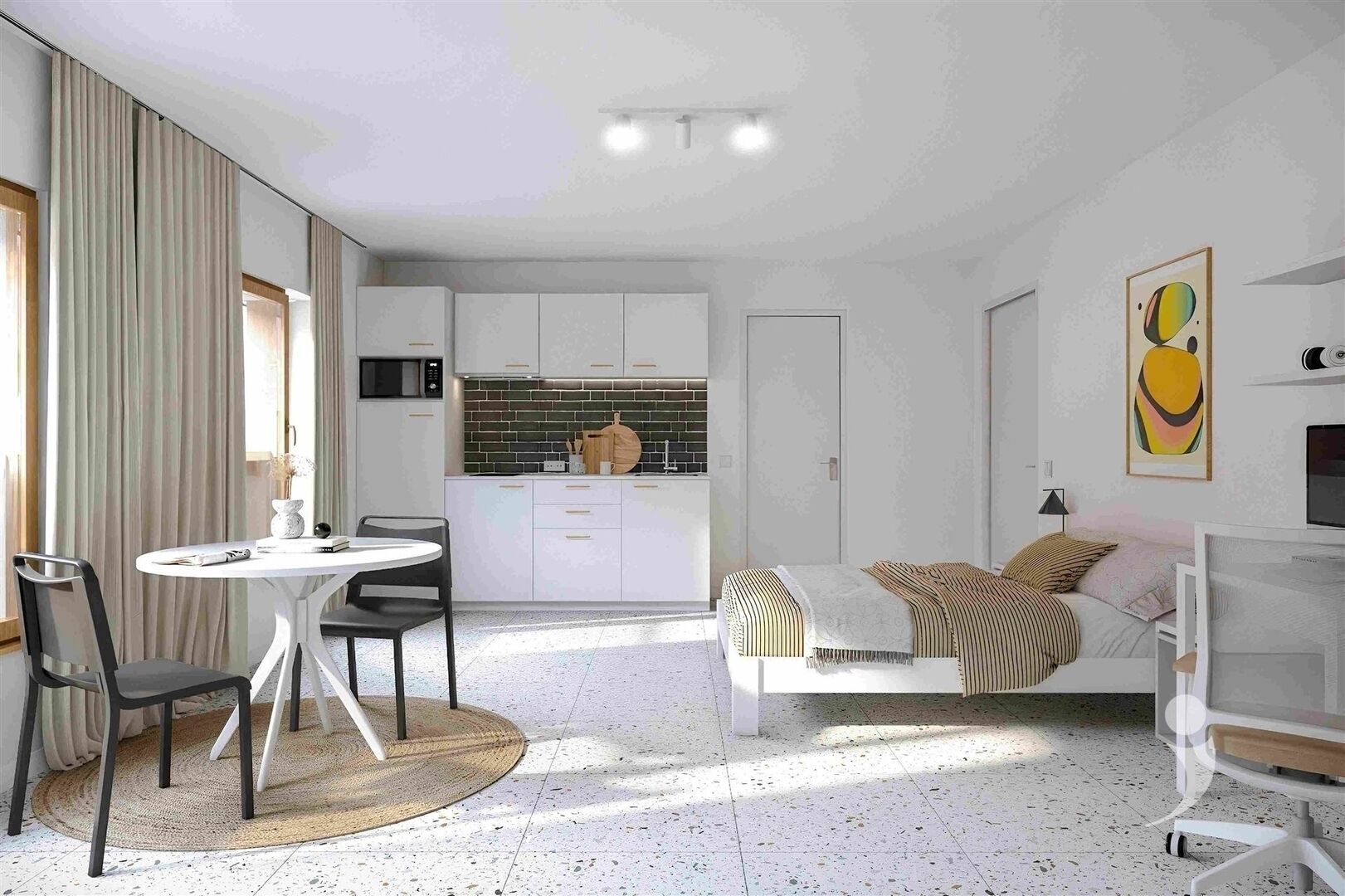 Full-fledged studio with independent layout and ample living space. Suitable for students who consciously choose more autonomy.Fourth floor, easily accessible by stairs or elevator, with use of the shared facilities of the residence.