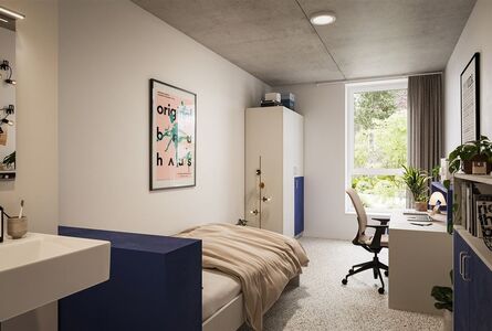 Depending on their location and equipment, the student rooms have a surface area of +/- 19m² or +/- 16m². They will be delivered fully furnished and equipped with their own washbasin with mirror. There are also rooms with a private shower and toilet. The student rooms are finished to a very high standard, enjoy beautiful views and are equipped with a heat pump (heating and cooling). Students can use the communal living kitchen, as well as a cool relaxation area. There is an allocated bike shed, locker and secure access to the building and room. The south-facing garden, proximity to bus stops and supermarkets are an added bonus!