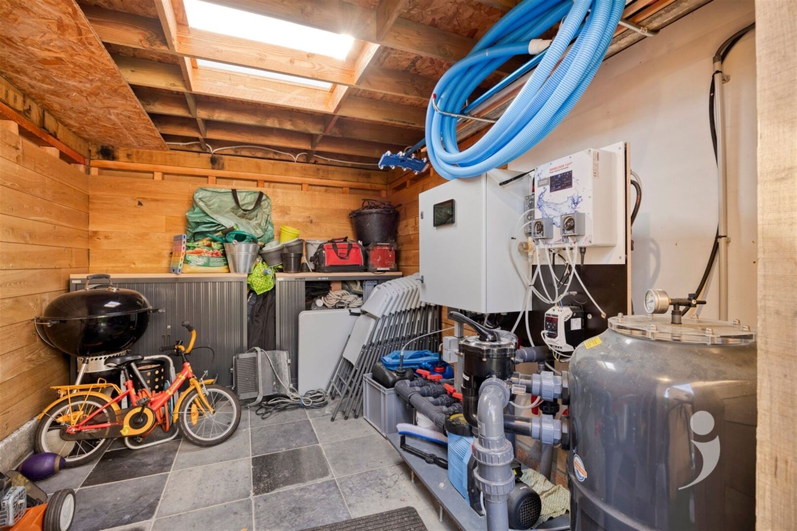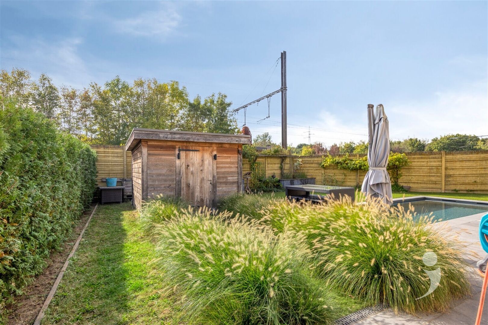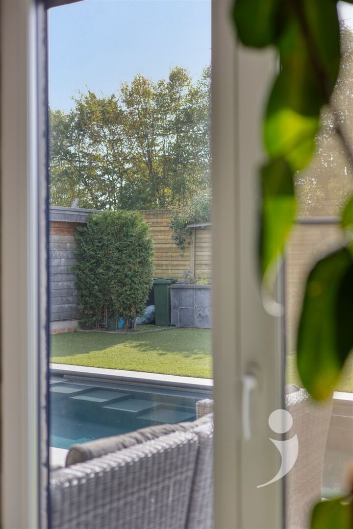Ook buiten is het heerlijk vertoeven. Dankzij de zuidwestelijke oriëntatie geniet je volop van de zon in de onderhoudsvriendelijke tuin. De groenzone is aangelegd met kunstgras, wat zorgt voor een strak geheel met minimaal onderhoud. Op warme dagen biedt het ingebouwde zwembad, verwarmd met warmtepomp, de perfecte verkoeling.