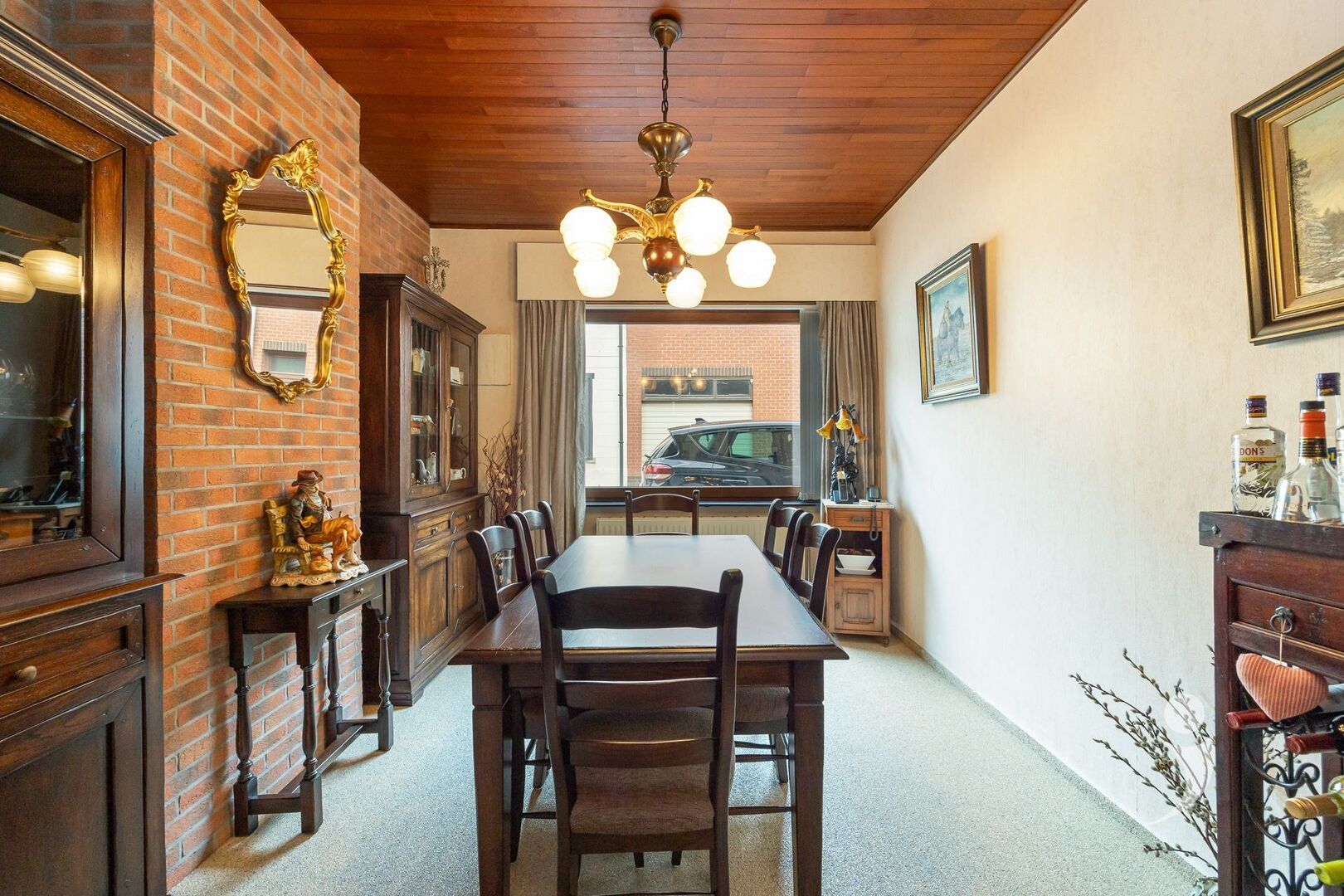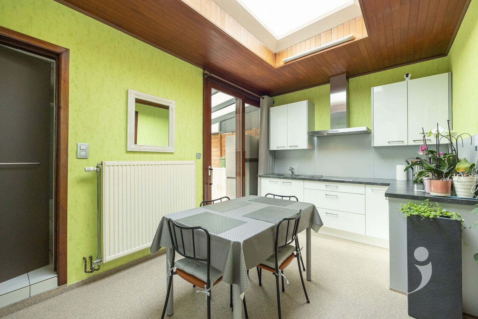 Via de inkomhal bereiken we de gezellige leefruimte met zithoek en eetplaats. Aansluitend bevindt zich een vernieuwde en volledig uitgeruste keuken met kookvuur, oven, ingebouwde frigo, vaatwasser, dubbele wastafel en voldoende kastruimte. Handig is ook de extra bergruimte onder de trap.