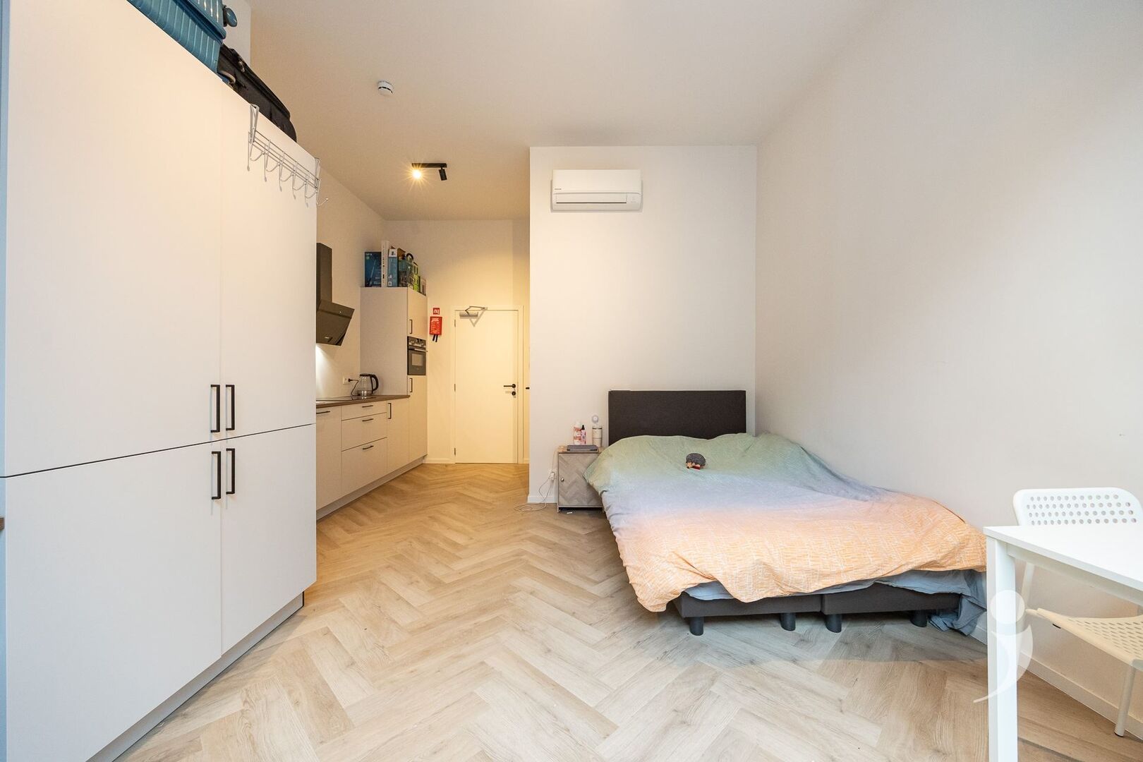 De studio bevindt zich op de eerste verdieping en is uitgerust met een energiezuinige lucht-lucht warmtepomp, die zorgt voor efficiënte verwarming in de winter en aangename verkoeling in de zomer. Ze wordt volledig bemeubeld verkocht en beschikt over een comfortabele boxspring, bureau met bureaustoel, ingebouwde kleerkast en gordijn. Daarnaast is er een praktische privatieve keuken met ontbijtblok, magnetron en koelkast, waardoor u geniet van alle comfort binnen uw eigen studio.